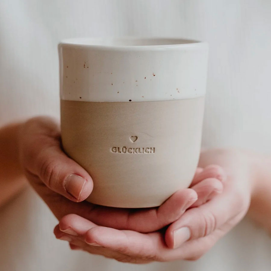 Der zauberhafte Becher "Glücklich" von Eulenschnitt ist ein klitzekleines Stück Lebensfreude. Aus hochwertigem Steingut gefertigt, zeigt er sich in einem zweifarbigen Design mit feinen Sprenkeln. Der liebevoll eingravierte Schriftzug "Glücklich" und das dezente Herz unterstreichen die Botschaft des Bechers: Glück liegt in den kleinen Dingen. Ob für deinen Morgenkaffee, als Stiftehalter oder als kleiner Blumentopf, dieser Becher ist vielseitig einsetzbar und bringt eine Portion Glück in deinen Alltag.