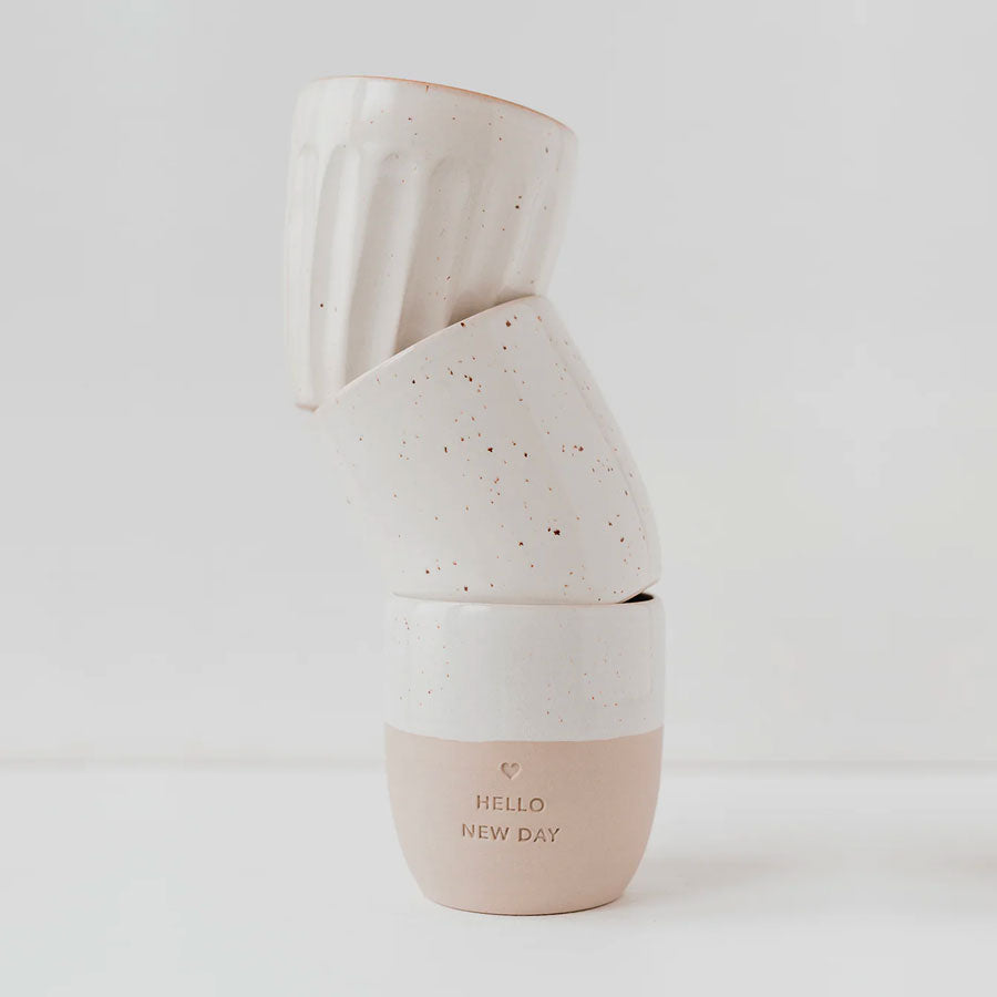 "Jeder Morgen ist ein neuer Anfang, und was gibt es Schöneres, als diesen mit einem Lächeln zu begrüßen? Der Becher "Hello New Day" von Eulenschnitt ist das perfekte Symbol für diese positive Einstellung. Mit seinem sanften Design und der herzlichen Botschaft ist er ein Gruß an jeden neuen Tag, der uns erwartet."