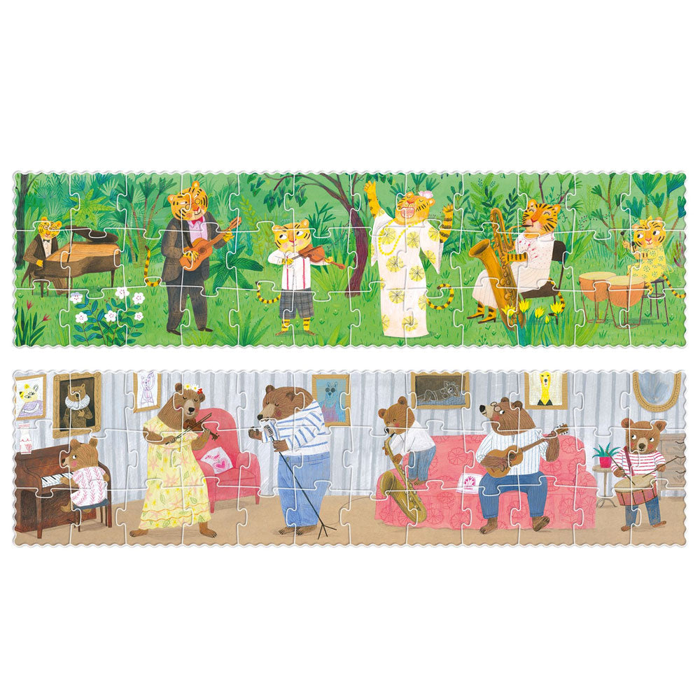 Bezauberndes Puzzle "Wild Music" von londji zum Wenden. Das Puzzle im Reiseformat zeigt zwei Szenen mit Tigern und Bären, die Musik spieln. Ein tolles Puzzle für die Zeit, in der Dein Kind die Musik entdeckt und darüber hinaus.