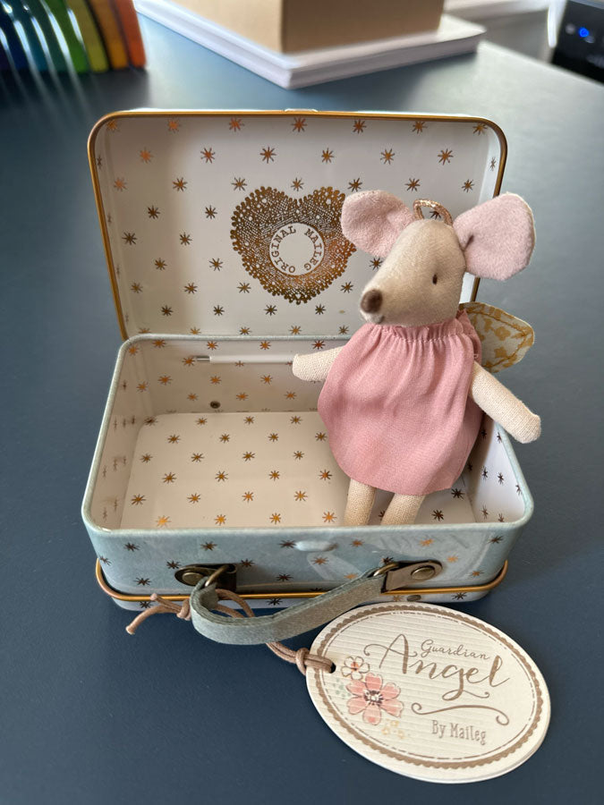 Jeder sollte so eine kleine Schutzengelmaus haben! Die niedliche Engelsmaus von Maileg wird in einem hübschen, kleinen Koffer geliefert - die Maus ist 7 cm groß und hat ein putziges Kleidchen an und hübsche Flügelchen am Rücken. Toll zum Verschenken geeignet oder als eigener kleiner Glücksbringer.
